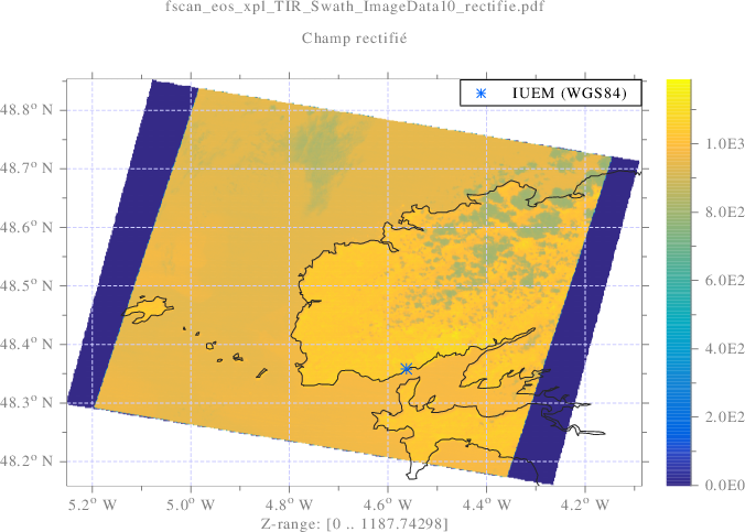 int fscan_eos_xpl(){ scltracefa(§, ƒ, ); scltracefc("scl-%s (%s) : %s\n", sclver(), sclsec(), temps_char(0)); scltracefc(" < hdf-eos-%s\n\n", sclver_eos()); std::string eosname="AST_L1B_003_09212000113746_09232003073119.hdf", eospath="./don/hdf/"+eosname; finfo_eos(eospath.c_str()); std::string dsname="TIR_Swath", dfname="ImageData10"; int scltype=0/*double*/, dimn; void **eos=fscan_eos(eospath.c_str(), dsname.c_str(), dfname.c_str(), scltype, &dimn); int *crdn=(int*)eos[0], vxn=crdn[0], xi, vyn=crdn[1], yi; double **val=(double**)eos[1]; double xa=0, xe=(double)vxn-1, ya=0, ye=(double)vyn-1; scl::string_c imgname=scl::string_c(ƒ)+"_"+dsname+"_"+dfname+".pdf", imgpath="./srt/"+imgname; grafmat_dis(imgpath.c_str(), vxn, vyn, val, "grid", "on", "colormap", "paruline", "subtitlex", imgname.c_str(), "linespeca", "-a", ); //--------------------------------------------------------------------- //[>LONGITUDE] //--------------------------------------------------------------------- scl::string_c gfname="Longitude"; eos=fscan_eos(eospath.c_str(), dsname.c_str(), gfname.c_str(), scltype, &dimn); crdn=(int*)eos[0]; int xn=crdn[0], yn=crdn[1]; double **lon=(double**)eos[1]; double *x=newtablin(xn, xa, xe), *y=newtablin(yn, ya, ye); //----------------------------------------------------------------- //[>RÉGRESSION PLANAIRE] //----------------------------------------------------------------- // equation du plan a estimer : x/a+y/b+z/c=1 int tn=xn*yn, ti=0; double **H=newmat<double>(tn, 3); for(xi=0;xi<xn;xi++){ for(yi=0;yi<yn;yi++){ H[ti][0]=x[xi]; H[ti][1]=y[yi]; H[ti][2]=lon[xi][yi]; ti++; } } // Pseudo-inverse double **_H=newmat<double>(3, tn); pinv(tn, 3, H, _H); double _a=0, _b=0, _c=0; // _H*[1;1;..;1] for(ti=0;ti<tn;ti++){ _a+=_H[0][ti]; _b+=_H[1][ti]; _c+=_H[2][ti]; } // Coefficients du plan double a_lon=1/_a, b_lon=1/_b, c_lon=1/_c; scltracefc("Plan Lon.: a=%lf, b=%lf, c=%lf\n", a_lon, b_lon, c_lon); //----------------------------------------------------------------- //[<RÉGRESSION PLANAIRE] //----------------------------------------------------------------- imgname.clear(); imgname=scl::string_c(ƒ)+"_"+dsname+"_"+gfname+".svg"; imgpath.clear(); imgpath="./srt/"+imgname; scl::string_c titlex="Plan approché : a="+num_str<double>(a_lon)+ ", b="+num_str<double>(b_lon)+", c="+num_str<double>(c_lon); grafmat_dis(imgpath.c_str(), xn, yn, lon, "grid", "on", "colormap", "paruline", "subtitlex", imgname.c_str(), "x", x, "y", y, "titlex", titlex.c_str(), "linespeca", "-a", ); //--------------------------------------------------------------------- //[<LONGITUDE] //--------------------------------------------------------------------- //--------------------------------------------------------------------- //[>LATITUDE] //--------------------------------------------------------------------- gfname.clear(); gfname="Latitude"; eos=fscan_eos(eospath.c_str(), dsname.c_str(), gfname.c_str(), scltype, &dimn); crdn=(int*)eos[0]; //xn=crdn[0]; yn=crdn[1]; double **lat=(double**)eos[1]; //double *x=newtablin(xn, xa, xe), *y=newtablin(yn, ya, ye); //----------------------------------------------------------------- //[>RÉGRESSION PLANAIRE] //----------------------------------------------------------------- // equation du plan a estimer : x/a+y/b+z/c=1 /*int tn=xn*yn,*/ ti=0; //double **H=newmat<double>(tn, 3), for(xi=0;xi<xn;xi++){ for(yi=0;yi<yn;yi++){ /*H[ti][0]=x[xi]; H[ti][1]=y[yi];*/ H[ti][2]=lat[xi][yi]; ti++; } } // Pseudo-inverse /*double **_H=newmat<double>(3, tn);*/ pinv(tn, 3, H, _H); /*double*/ _a=0; _b=0; _c=0; // _H*[1;1;...;1] for(ti=0;ti<tn;ti++){ _a+=_H[0][ti]; _b+=_H[1][ti]; _c+=_H[2][ti]; } // Coefficients du plan double a_lat=1/_a, b_lat=1/_b, c_lat=1/_c; scltracefc("Plan Lat.: a=%lf, b=%lf, c=%lf\n", a_lat, b_lat, c_lat); //----------------------------------------------------------------- //[<RÉGRESSION PLANAIRE] //----------------------------------------------------------------- imgname.clear(); imgname=scl::string_c(ƒ)+"_"+dsname+"_"+gfname+".svg"; imgpath.clear(); imgpath="./srt/"+imgname; titlex.clear(); titlex="Plan approché : a="+num_str<double>(a_lat)+ ", b="+num_str<double>(b_lat)+", c="+num_str<double>(c_lat); grafmat_dis(imgpath.c_str(), xn, yn, lat, "grid", "on", "colormap", "paruline", "subtitlex", imgname.c_str(), "x", x, "y", y, "titlex", titlex.c_str(), "linespeca", "-a", ); //--------------------------------------------------------------------- //[<LATITUDE] //--------------------------------------------------------------------- // Dynamique géodésique (🗺 dislin) double lona=rd, lone=-rd, clon, lon_rad; double lata=rd, late=-rd, clat, lat_rad; double cnul=0, cx, cy, cz; for(xi=0;xi<xn;xi++){ for(yi=0;yi<yn;yi++){ clon=lon[xi][yi]; lon_rad=clon/180*π; clat=lat[xi][yi]; lat_rad=clat/180*π; // Passage coordonnées géocentriques/sphériques (🗺 hdf-eos) // vers coordonnées géodésiques (🗺 dislin) llac_xyze(1, &lon_rad, &lat_rad, &cnul, &cx, &cy, &cz); xyze_llg(1, &cx, &cy, &cz, &clon, &clat); clon=clon/π*180; clat=clat/π*180; if(lona>clon){ lona=clon; } if(lone<clon){ lone=clon; } if(lata>clat){ lata=clat; } if(late<clat){ late=clat; } } } // Surface et longueur d'un pixel rectifié double sx=(lone-lona)*(late-lata)/(((double)vxn)*((double)vyn)), lx=(sx); int stlonn=(int)round((lone-lona)/lx), stloni; double *stlon=newtablin(stlonn, lona, lone); int stlatn=(int)round((late-lata)/lx), stlati; double *stlat=newtablin(stlatn, lata, late); int stn = stlonn*stlatn, sti; scltracefc("stn=lonn*latn=%d*%d=%d\n", stlonn, stlatn, stn); double *stx=new double[stn], *sty=new double[stn]; int *stin = new int[stn]; for (stloni=0;stloni<stlonn;stloni++){ clon=stlon[stloni]; lon_rad=clon/180*π; for (stlati=0;stlati<stlatn;stlati++){ clat=stlat[stlati]; lat_rad=clat/180*π; // Passage géodésique (🗺 dislin) vers // géocentrique (🗺 hdf-eos) llg_llc(1, &lon_rad, &lat_rad, &clon, &clat); clon=clon/π*180; clat=clat/π*180; sti = stlati + stloni*stlatn; // Résolution du